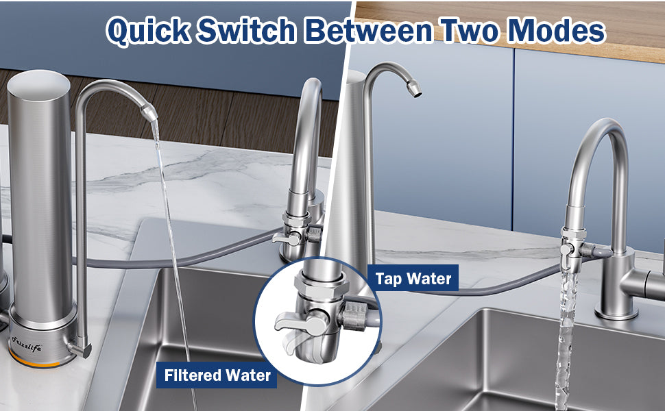 【Safe, Durable Materials & Reinforced Construction】Frizzlife TS99 countertop water filtration system is made from food-grade and lead-free 304 stainless steel. By only using safe and reliable materials, TS99 countertop water purifier is designed for healthy and fresh water. The thickened filter housings (1mm) are corrosion-resistant, durable and can be used for years. The whole system has passed 100,000 times water hammer test and 10,000 times pulse tests. No more burst concern.