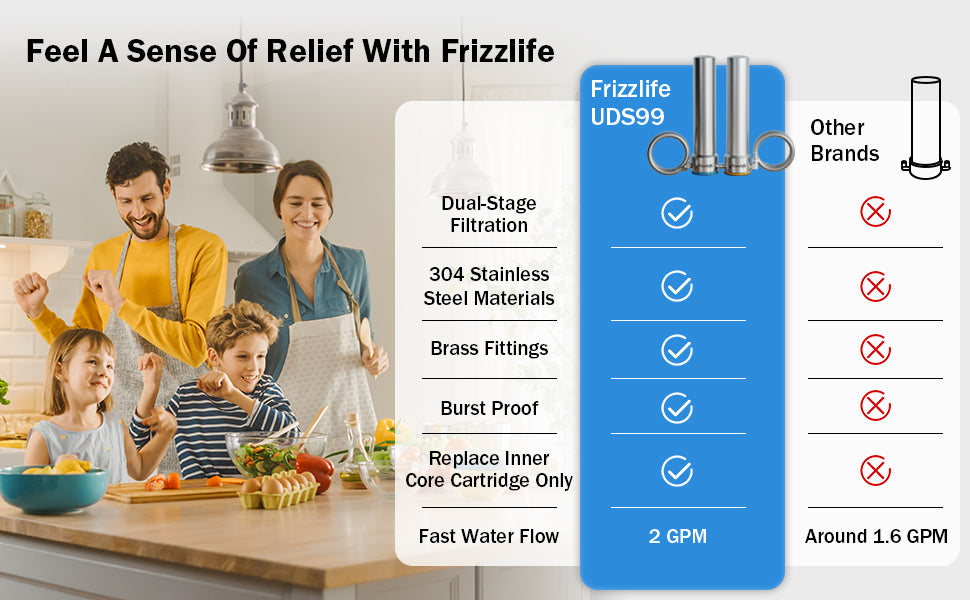 - A diferencia de otras marcas que utilizan accesorios de plástico baratos y frágiles, el sistema de filtración de agua de doble etapa Frizzlife UDS99 utiliza accesorios de latón sin plomo de alta calidad. Por lo tanto, garantiza una filtración de agua más segura y confiable.