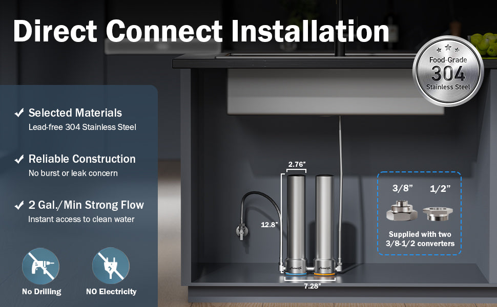【3 Mins Install & No Drilling】UDS99 water filter should be directly connected to the main kitchen sink cold water line, no need to drill a hole on the granite. Prefect for renters and for people who can't install a separate dedicated faucet. Fits for both 3/8'' and 1/2'' U.S. standard sinks (3/8" to 1/2" converter fittings included).