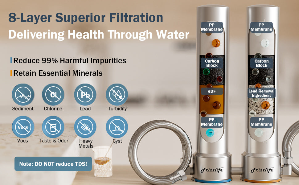 【8-Stage Deep Filtration】Frizzlife UDS99 under sink water filter system provides 8-stage deep filtration. The 1st stage adopts high grade PP membrane and activated coconut shell carbon block, which also blended with KDF. The 2nd stage features with 0.5 micron filtration precision, by combining carbon block and lead removal ingredients, it can effectively reduce Lead, Chlorine, Fluoride, Heavy Metals, VOCs, bad taste & odor and other harmful contaminants. The essential minerals are still kept.