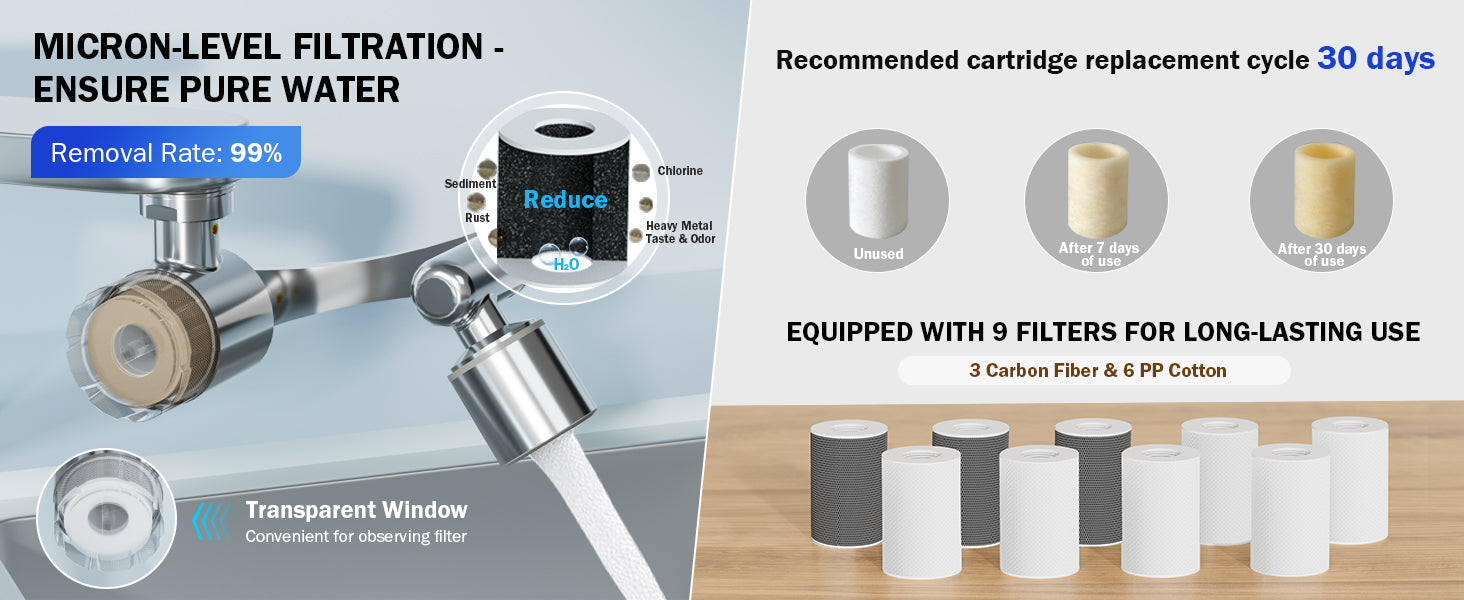 【NSF Certified Micron-Level Filtration】 Frizzlife micron-level filtration system reduces 99% of chlorine, pollutants, heavy metals, and unpleasant tastes and odors, promoting a healthier lifestyle for your family. You can enjoy clean, great-tasting water at any time. The system includes 6 PP cotton and 3 carbon fiber filter cartridges, which can be replaced multiple times to avoid frequent purchases. The replacement cycle is 30 days