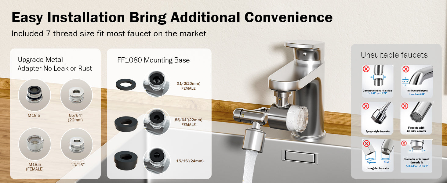 【Perfectly Fits 99% of Family Faucets & 3s Installation】 The Frizzlife Faucet aerator provides 7 sizes for connection. FEMALE: 55/64”(22mm), G1/2(20mm), M18.5. MALE: 55/64”(22mm), 15/16”(24mm), 13/16”, M18.5. These thread sizes are suitable for 99% of American household faucets, and we provide a complete set of installation tools in the packaging, allowing you to make a confident purchase and easily install in the kitchen, bathroom, laundry room, etc. If you have any questions, Frizzlife provides 24/7 buyer support and after-sales service